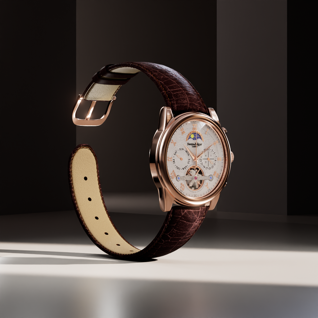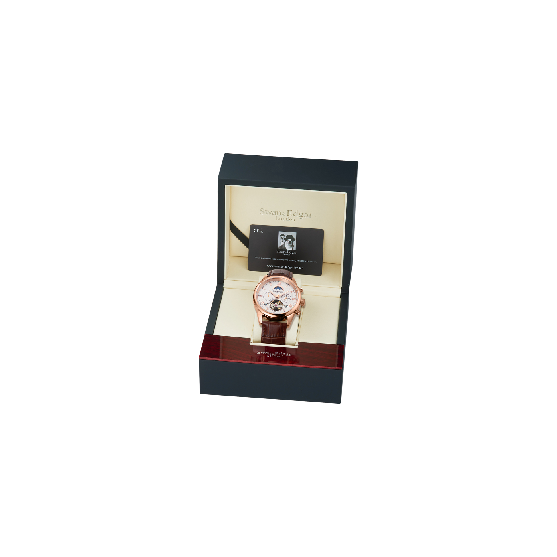 The polished stainless steel case is complemented by a sapphire crystal and a skeletonised case back, revealing the intricate movement within. Attention to detail extends to the serrated edge crown for ease of adjustment and a hand-waxed tobacco brown leather strap, finished with a Swan & Edgar-etched logo buckle, adding a refined touch to this understated, yet luxurious timepiece.