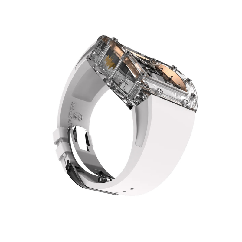 The case’s top and bottom are crafted from “Technology Sapphire”—lab-grown sapphire crystal—offering unmatched clarity and durability. The middle uses transparent organic glass, creating a seamless, 360° view into the watch’s heart. -