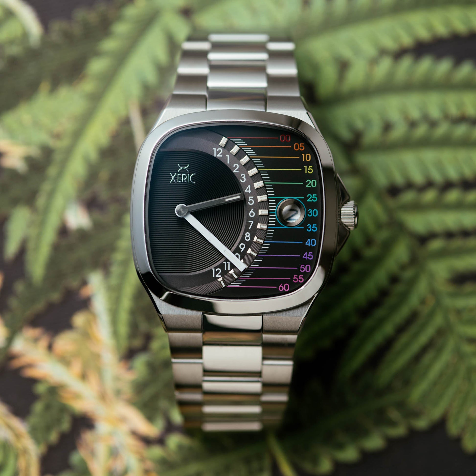 The Timeline Retrograde is powered by the high end Miyota 9015 movement with a custom built retrograde complication. Every 60 minutes the flyback mechanism launches the minute hand back to zero in an instant, in the most dramatic and satisfying way, unlike any other traditional watch. And every 12-hour transition from AM to PM or vice versa, the hour hand does the same. The retrograde complication enables the dial to have a linear time display, with intuitive, easy to read time telling, but completely unique in design.